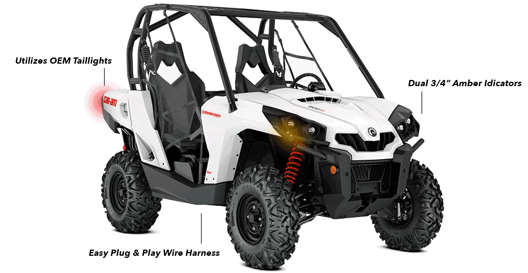 The best Can-Am Commander plug-and-play turn signal kits are from Corbin Custom Works! These signal kits achieve a completely OEM rear indicator look by using the existing factory tail lights. The all-new 2021+ Commander kits include our Ghost Signature Lights for an OEM appearance. These lights are dual-color and will retain the factory white running light functionality, but the light will flash amber with a sequential pattern to get you noticed when you turn on the turn signal. 2010-2020 Commander turn signal kits include four super-bright 3/4″ LEDs to provide 180°+ of front indicator visibility! All Corbin Custom Works turn signal kits have hazard rocker switch/functionality upgrades available. Each of our kits comes with thorough, easy-to-read and illustrated, installation guides making installation a snap!