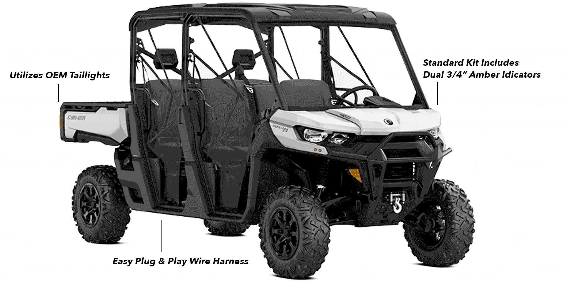 Corbin Custom Works makes the best Can-Am Defender plug & play turn signal kits! These signal kits achieve a completely OEM rear indicator look by using the existing factory tail lights. We include either four super-bright 3/4″ LEDs to provide over 180° of front indicator visibility or upgrade to our Ghost Signature Light replacements allow you to use the OEM running light locations as your front turn indicators! All Corbin Custom turn signal kits have hazard rocker switch/functionality upgrades available. Each of our kits comes with thorough, easy to read and illustrated, installation guides making installation a snap!