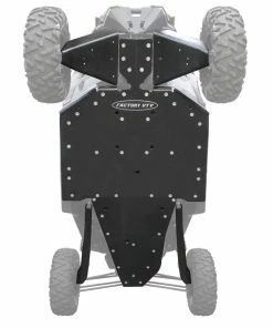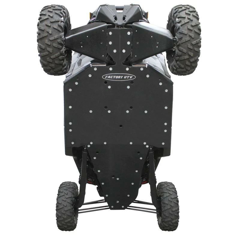 Factory UTV’s Can Am Maverick X3 X rs Ultimate UHMW Skid Plate Kit has your Maverick X3 Xrs covered! The Can Am X3 OEM protection falls seriously short in a couple areas. Can Am uses HMW which has 1/10th the impact strength compared to the UHMW used for Factory UTV’s Armor. This is an important distinction on a machine as big and fast as the X3. The X3’s Clutch Cover is extremely vulnerable to damage from below with the OEM protection. Our Armor addresses the clutch cover vulnerability with coverage that extends out and around the cover to protect it from below. We’ve also added an X-Brace option under the engine/trans area of the X3. The X-Brace consists of a 1/8″ 6061 High Strength Aluminum sheet that gets sandwiched between the UHMW skid and X3 Frame during installation. If your going to play hard in your X3, you’ll need the added X-Brace protection. The X3 engine/trans is precariously close to the skid plate on an X3. We’ve also added a front differential skid plate covering an area left bar by the OEM. This diff plate is molded to conform with the X3 in that area. These are the same X3 UHMW Armor products you’ll see on the Can Am X3’s of top Can Am factory racers like Kyle Chaney, Marc Burnett and Monster Matt Burroughs to name just a few. They depend on Factory UTV UHMW Armor to get them to the finish line under the most demanding of race conditions. Join the #futvarmy and protect your X3 with the best Armor in the world, Factory UTV UHMW Armor!OEM skid plates simply do not satisfactorily protect the underside of your UTV under normal off road operation. Factory UTV has the answer with skid plates constructed from UHMW (Ultra-High Molecular Weight) plastic. Significantly lighter than aluminum, FUTV skids, Sliders and A-Arm guards offer full protection for the undercarriage of your Maverick. UHMW is tough, wear resistant plastic that combines an incredibly low coefficient of friction with outstanding impact strength, and will outwear carbon steel 10 to 1. Unlike aluminum, UHMW also has memory, meaning after a big impact hits aluminum will bend ,gouge and break while UHMW maintains it’s original shape. These skid plates are very TOUGH! Protect your investment today!
