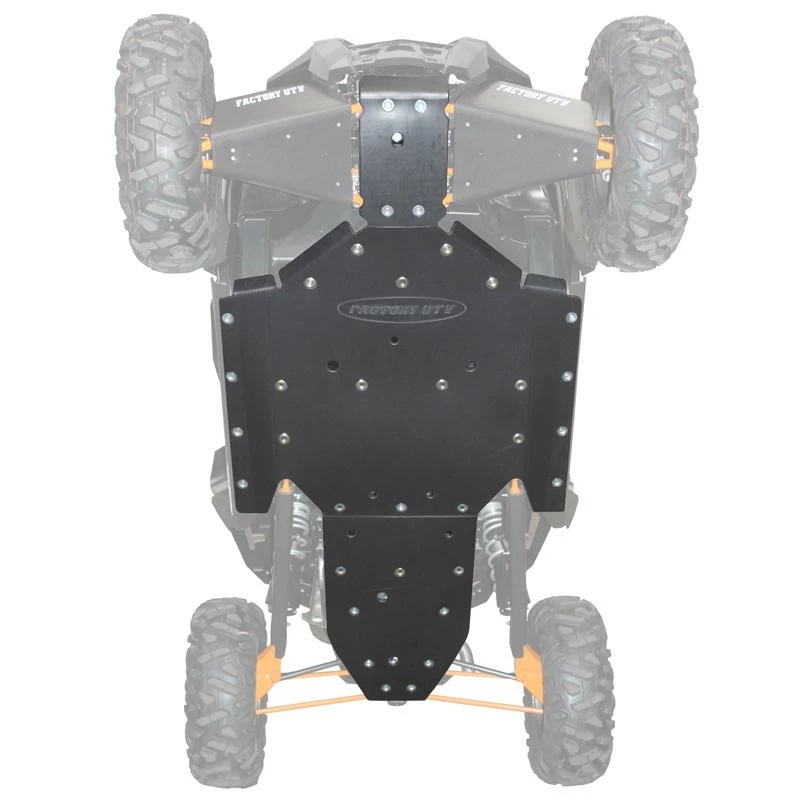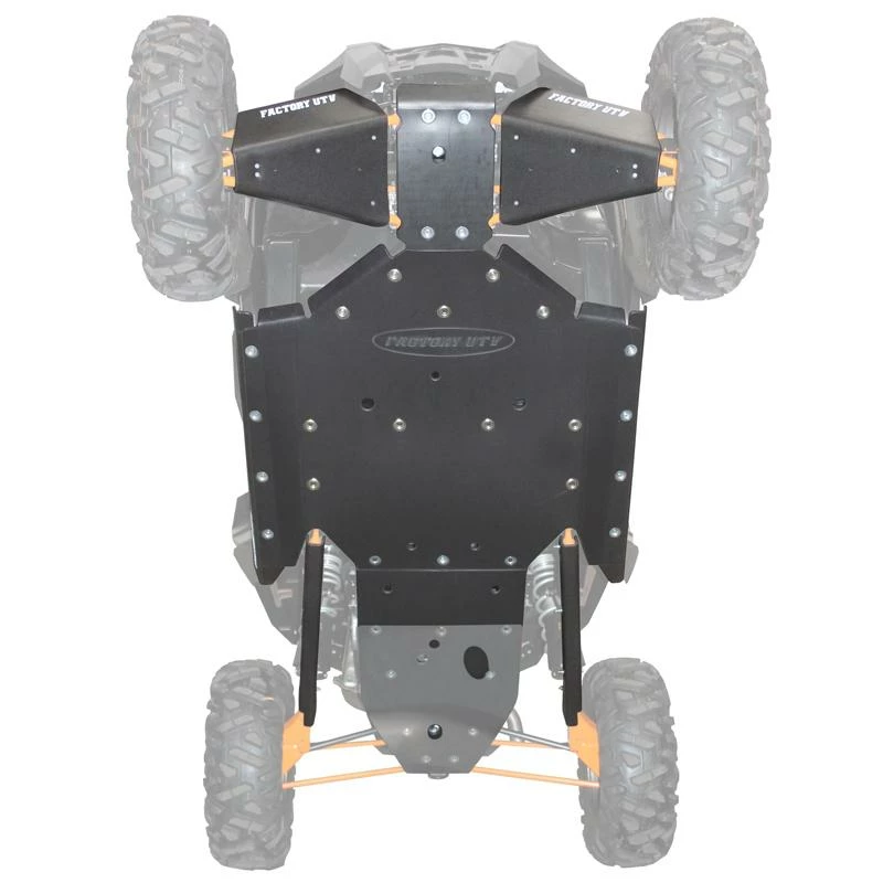 Factory UTV’s UHMW Skid Plates are the gold standard for UTV protection systems. OEM skid plates simply do not satisfactorily protect the underside of your UTV under normal off road operation. With items as important as your fuel tank and hydraulic lines right above the skid plates an alternative to the OEM skids is imperative for fun and safe off roading. Factory UTV has the answer with skid plates constructed from UHMW (Ultra-High Molecular Weight) plastic. Significantly lighter than aluminum, FUTV skids and A-Arm guards offer full protection for the undercarriage of your UTV. We’ve also added an X-Brace option under the engine/trans area of the RZR XP. “ ½” or 3/8” UHMW rear skid with an 1/8” inch 6061 high strength aluminum backing plate, X brace aluminum backing plate is installed in between UHMW skid and chassis frame, and limits the amount of impact absorbing skid plate flex in the rear vital areas. If your going to play hard in your RZR XP, you’ll need the added X-Brace protection. UHMW is tough, wear resistant plastic that combines an incredibly low coefficient of friction with outstanding impact strength, and will outwear carbon steel 10 to 1. Unlike aluminum, UHMW also has memory, meaning after a big impact hits aluminum will bend ,gouge and break while UHMW maintains it’s original shape. These skid plates are very TOUGH! Protect your investment today!