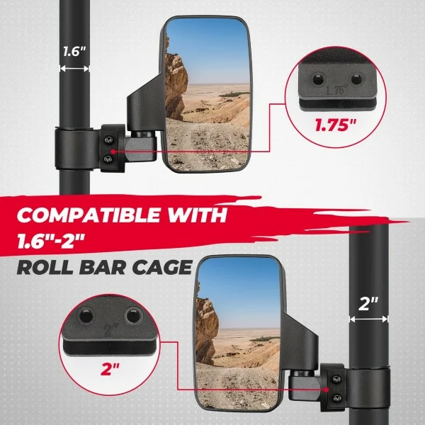 These utv side mirrors Fit almost all UTVs “s with 1.6″-2” diameter round tube roll cages – Compatible with Polaris Kawasaki Pioneer and Can-Am.It comes with extra rubber spacers and two mounts to connect to any tube on your UTV.