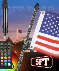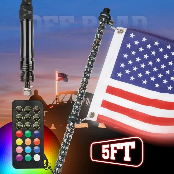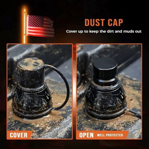3.Kemimoto lighted whips for utv have a quick-release mounting base for easy to install or take off, and you can also use the dust cap to prevent mud or sand stuck on the base. And American Flag with adjustable mounting clamps to prevent the flag from entangling, let the flag gone with wind freely. Package includes One 5ft whip light, one remote control, one USA flag, flag mounting hardware, dust cap and installation instruction. If you need a replacement, pls don’t hesitate to let me know.