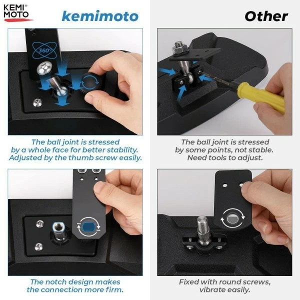 This updated rearview mirror is improved in the connection between the mirror and the bracket. Notch design and joint-ball stressed by a face can make the mirror more stable when you riding. Don’t worry it will wobble.