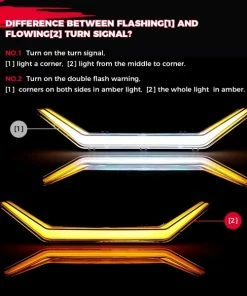 - FLASHING AND FLOWING – What difference between flashing [1] and flowing [2] turn signal? NO.1 Turn on the turn signal, [1] light a corner, and [2] light from the middle to the corner. NO.2 Turn on the double flash warning, [1] corners on both sides in amber light, [2] the whole light in amber.