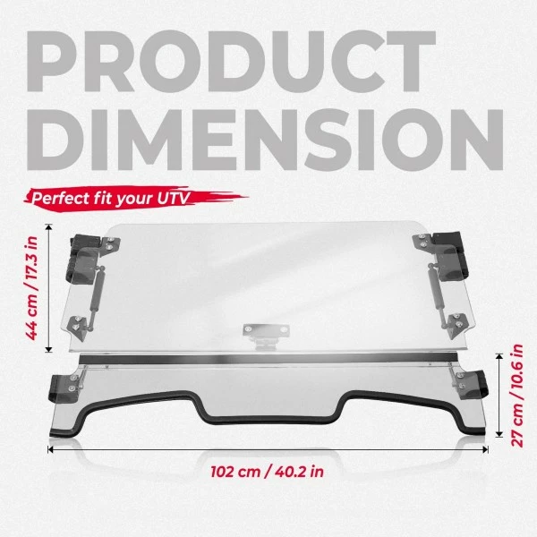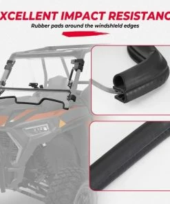 High strength and durability. The flip-up windshield is made of 1/4″ polycarbonate material, which is 250 times stronger than glass. The bottom of the flip windshield is wrapped with anti-seismic rubber pads, which not only makes the windshield fit your UTV perfectly, but also ensures that it will not be damaged during bumpy driving.