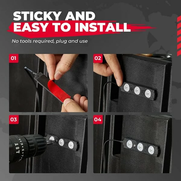 Cargo bed lights are equipped with a super sticky sticker, which can be attached to any position on the body without drilling. There are also reserved mounting holes on the body light and also supports screw fixing, double protection, and firm installation.