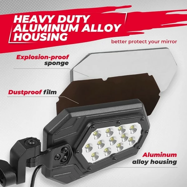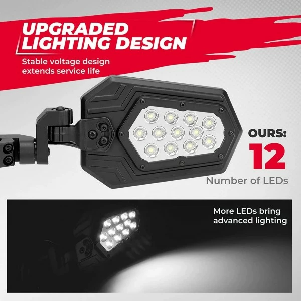 SUPER BRIGHT LIGHT: The utv side mirrors are designed with 12 leds, containing a stable current design, which provide you with brighter light and longer life.
