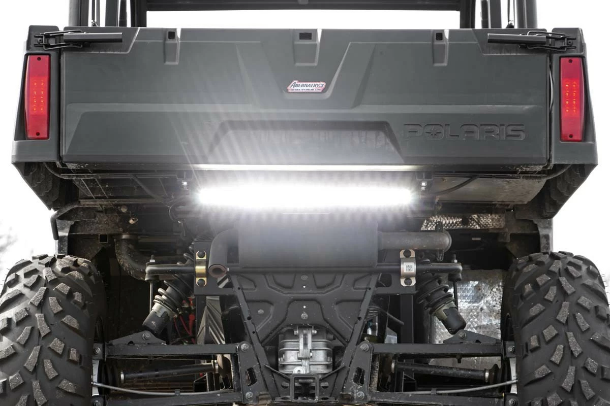 COMMAND THE DARK with Rough Country’s Rear-Facing Lower 20-inch Single-Row LED Kit for Polaris Ranger models. This handy solution includes everything you need to upgrade your Ranger with a 20-inch LED light bar mounted under the bed for outstanding illumination in a very convenient location.