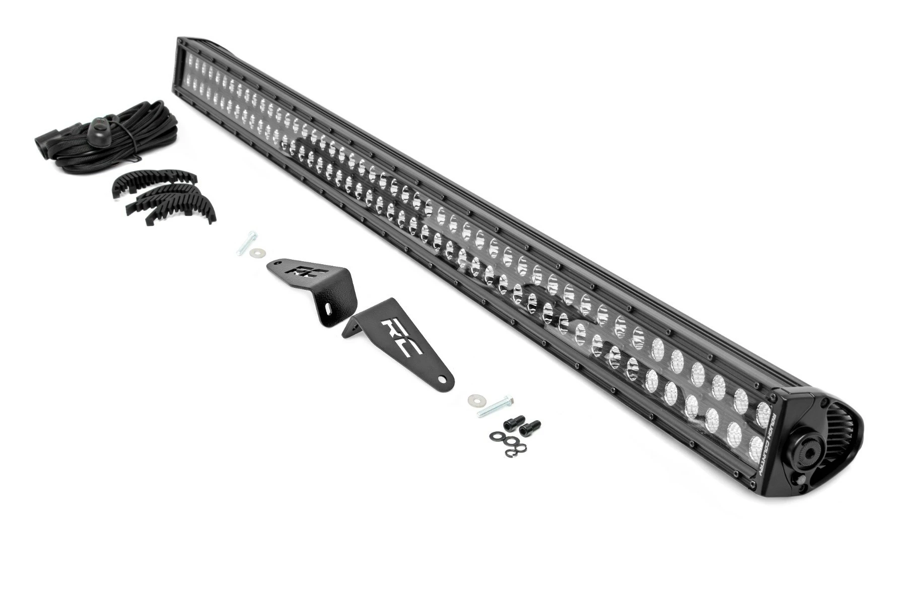 Parts: 50-inch LED Light Bar, Wiring harness, On/Off switch, Mounting brackets, Snap-on cover, Hardware