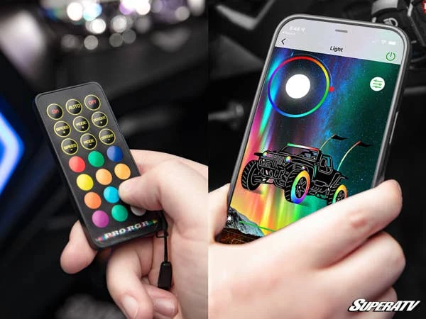 These lights can integrate with your sound system and SuperATV whip lights, so they can all sync up to your music. Just download the app on your phone to get full control of all your RGB lighting.
