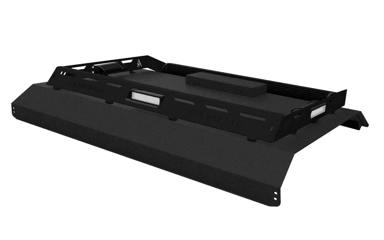 Thumper Fab Level 1 Metal Roof for your Tracker 800SX single cab with 360° Light Package & Integrated Roof Rack featuring our super strong HD Aluminum roof with steel side rails is lightweight HD powder coated for extreme corrosion protection, and it’s still STRONG ENOUGH TO STAND ON!Â