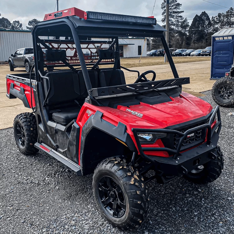 We set out to design the strongest and lightest aftermarket roof packed with features for your Tracker Off Road 800SX 3 Seat single cab. This all metal design is TOUGH. Tough enough to pile all your gear on the roof rack and even tough enough to stand on! That should make filling the deer feeder easier! Bye Bye Ladder!Â